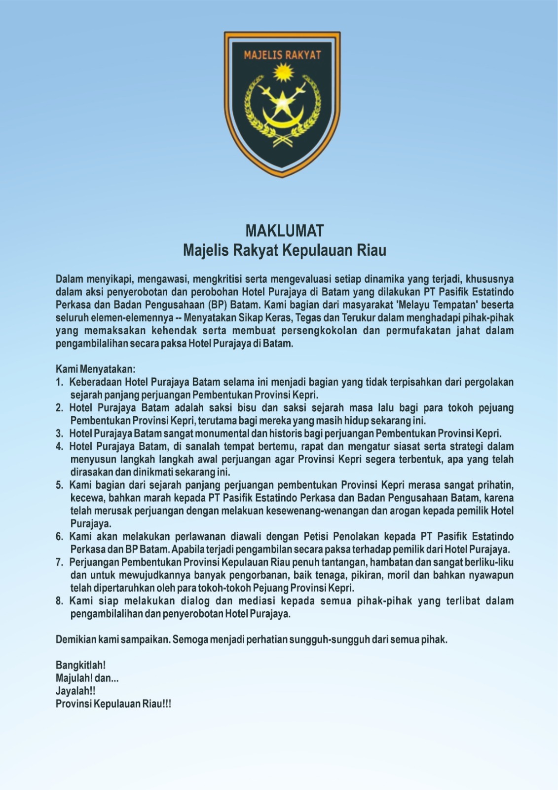 Daulatkepri.Com) Majelis Rakyat Kepulauan Riau (MRKR) menerbitkan maklumat keras berisi perlawanan terhadap PT Pasifik Estatindo Perkasa (PEP) dan jaringannya serta Badan Pengusahaan (BP) Batam menyusul perobohan hotel pada 21 Juni 2023. Mereka mengutuk aksi perobohan karena hotel Purajaya merupakan simbol perjuangan pergerakan Melayu dan Kepri.